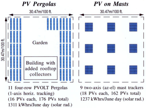 Several PVO Pergola arbors arranged in a garden or on a terrace roof can harvest more summer solar energy per given site area than several PV 2-axis trackers on masts, mainly because more PV panels are possible. To illustrate how PV can help during the summer peak, two possibilities on a 100ft/30.47m square site in Madison, Wisconsin with 10ft2/0.93m2 PV panels were compared for a June day solar radiation (per NREL-463-5607, 4/94).